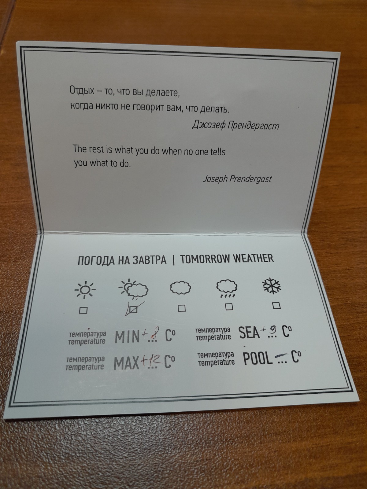А утром в сопровождении класической музыки Вас ждет завтрак (меню завтраков на выбор). Из напитков - Игристое, Фреш, Чай, Кофе. И..... пожелание прекрасного отдыха.